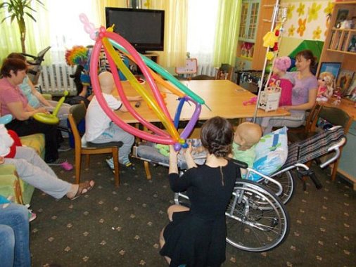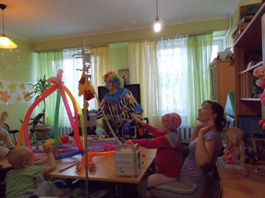 В Городском онкологическом центре настоящим шоу из шариков и мыльных пузырей увлек детей веселый клоун.