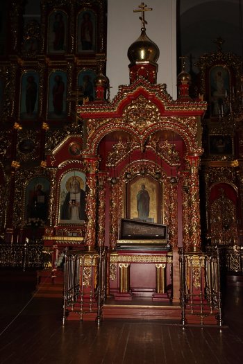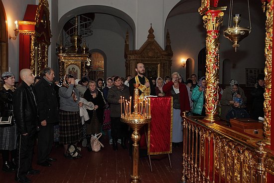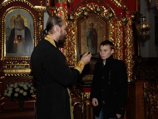 В Свято-Пантелеймоновском соборе отец Евгений отслужил молебен перед ковчегом с частицами мощей Вмч. Пантелеимона, Свт. Николая, Прп. Серафима Саровского, Сщмч. Владимира Киевского и Прпп. Киево-Печерских Святых. Паломники приложились к частичкам святых мощей, а отец Евгений помазал всех маслом от лампадки. После молебна у паломников было свободное время, что бы подать записки, приобрести иконы, книги и немного помолится на вечернем Богослужении.
