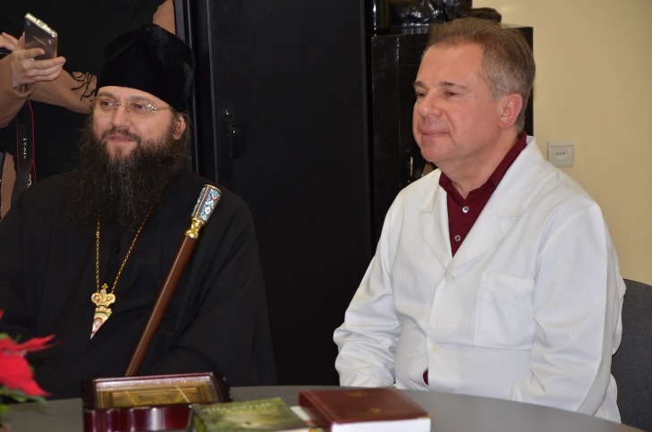 За традицією вітальна акція завершилася у Національній дитячій спеціалізованій клініці «ОХМАТДИТ». В кабінеті директора Юрія Івановича Гладуша відбулася зустріч адміністрації лікарні з Головою Учбового комітету при Священному Синоді УПЦ, професором єпископом Ірпінським Климентом, Представниками Дитячого паломницького центру на чолі з керівником, настоятелем лікарняного храму в честь св. Косми та Даміана Римських протоієреєм Євгенієм Мелешкіним, організатором і працівником центру, насельницею Спасо-Преображенського жіночого монастиря (смт. Пісківка Бородянського р-ну, Київської області) черницею Нікою та настоятелем храму Почаївської Божої Матері протоієрей Олексієм Артюхом та протоієреєм Владиславом Доломанським.