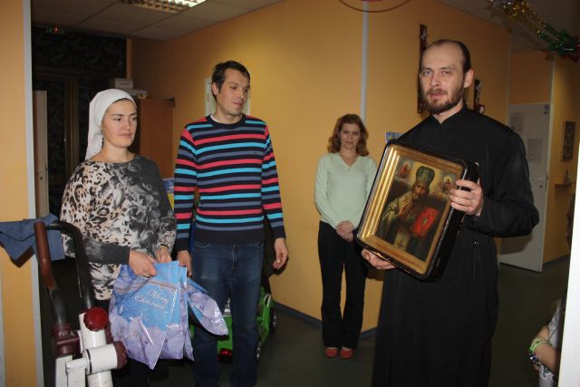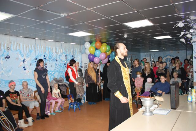 В отделениях Института рака и Городского онкологического центра отец Евгений Мелешкин отслужил молебен св. Николаю, во время которого родители и детки смогли помолиться, попросить святого о помощи. Отец Евгений привез с собой чудесным образом обновившуюся икону святителя Николая из храма Косьмы и Дамиана. Дети и родители смогли приложиться к иконе, батюшка помазал всех елеем, привезенным из г.Бари в Италии, где находятся мощи святителя. К тем детям, которые не смогли выйти в холл, батюшка зашел в палаты.